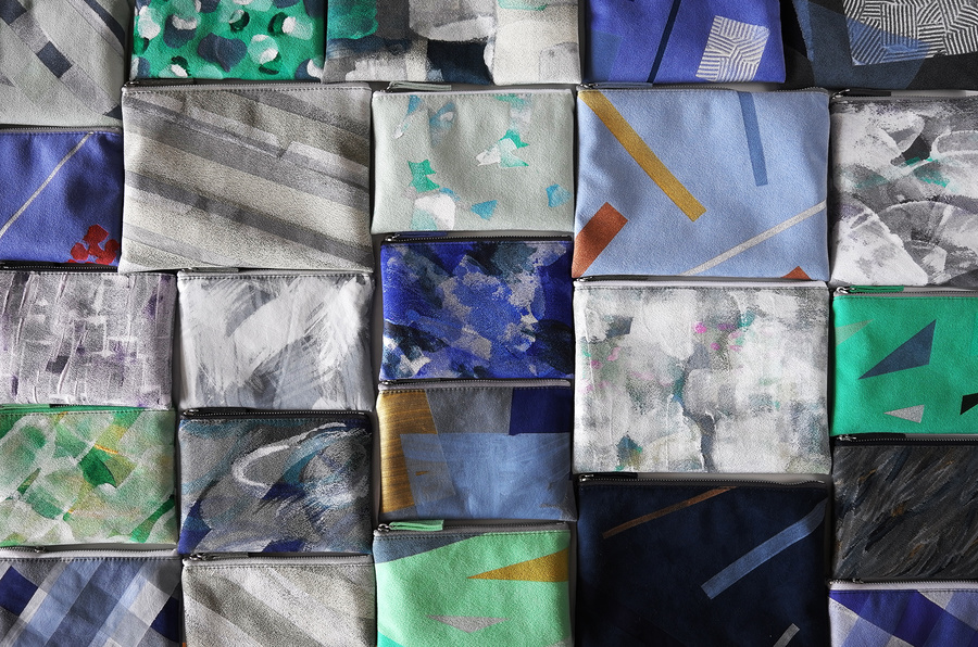 Each begins with a theme—set for a season or exhibition—and is painted directly onto canvas or faux leather.